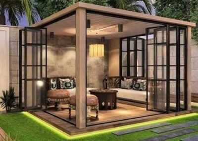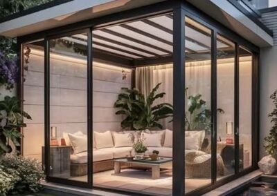 استمتع بإطلالة حديقتك في كل الفصول. تصمم مظلات وسواتر الرياض غرفاً زجاجية معزولة بالكامل باستخدام هياكل ألومنيوم متينة وزجاج سيكوريت مزدوج، لتمنحك مساحة دافئة وحميمة مع إطلالة بانورامية لا مثيل لها، معزولة تماماً عن البرودة والضوضاء.